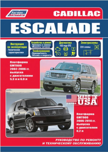 2. "Монолит". Обложка в золотисто-черных тонах. Тираж 250 экз. Видимо были переиздания. Вроде как заточено непосредственно под Escalade gmt900. По крайней мере та часть, что касается эксплуатации. Много лишней воды, как обычно у этого издательства. Что касается ремонтов - точно так же, как у "Легион-Автодата", картинка и текст без подробностей. Электросхем крайне мало. Выбрали их не пойми по какому принципу и без пояснений для несведущих. Что переведено в книге - переведено плохо. Фраза "транспортное средство" - буквально в каждом абзаце.