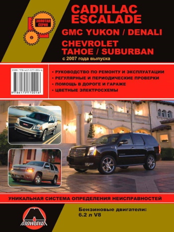 1. "Легион-Автодата". Обложка в красных тонах. Издательство сотрудничало с autodata.com, порталом, который работает на платной основе для ремонтников и прочих. Книга, по известным мне 2013 и 2015 года издания, кроме обложки, форзаца и страничек с рекламой, репринт книги для Chevrolet Tahoe 2-го и 3-го поколений того же издательства 2010 г (было несколько переизданий). Загружено в книгу все вперемешку по всем машинам платформ gmt800/gmt900. Заточено больше на Tahoe 2-го поколения. Найти что то на Escalde 3-го надо еще постараться. Основной текст - картинки для ремонтов без пояснений где что и как.