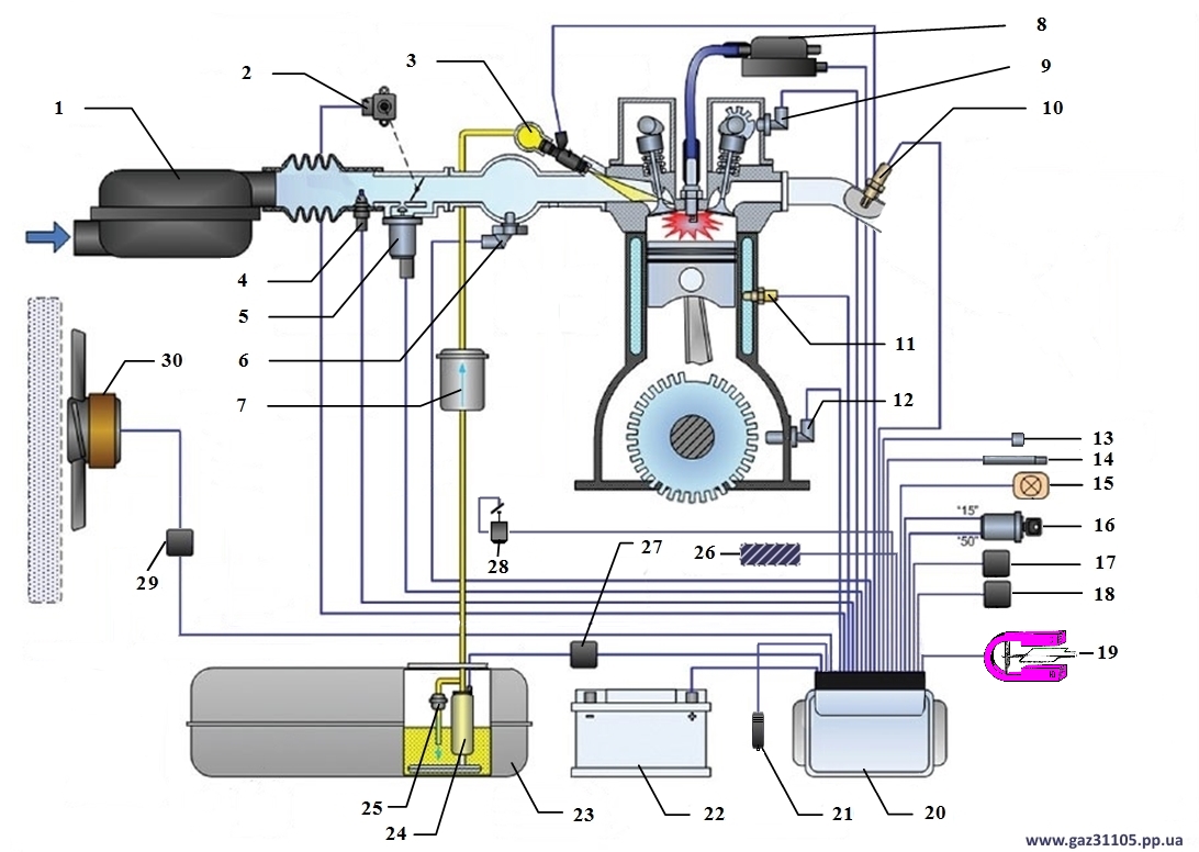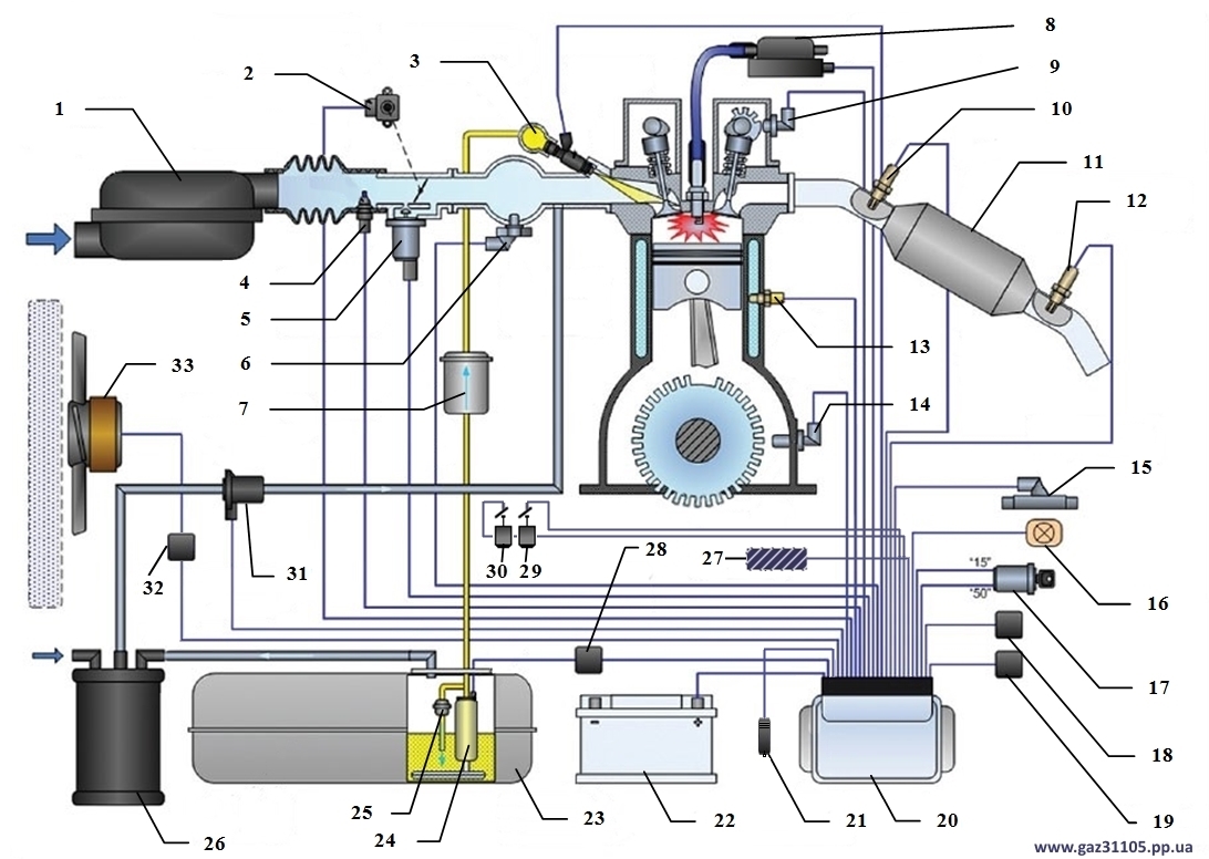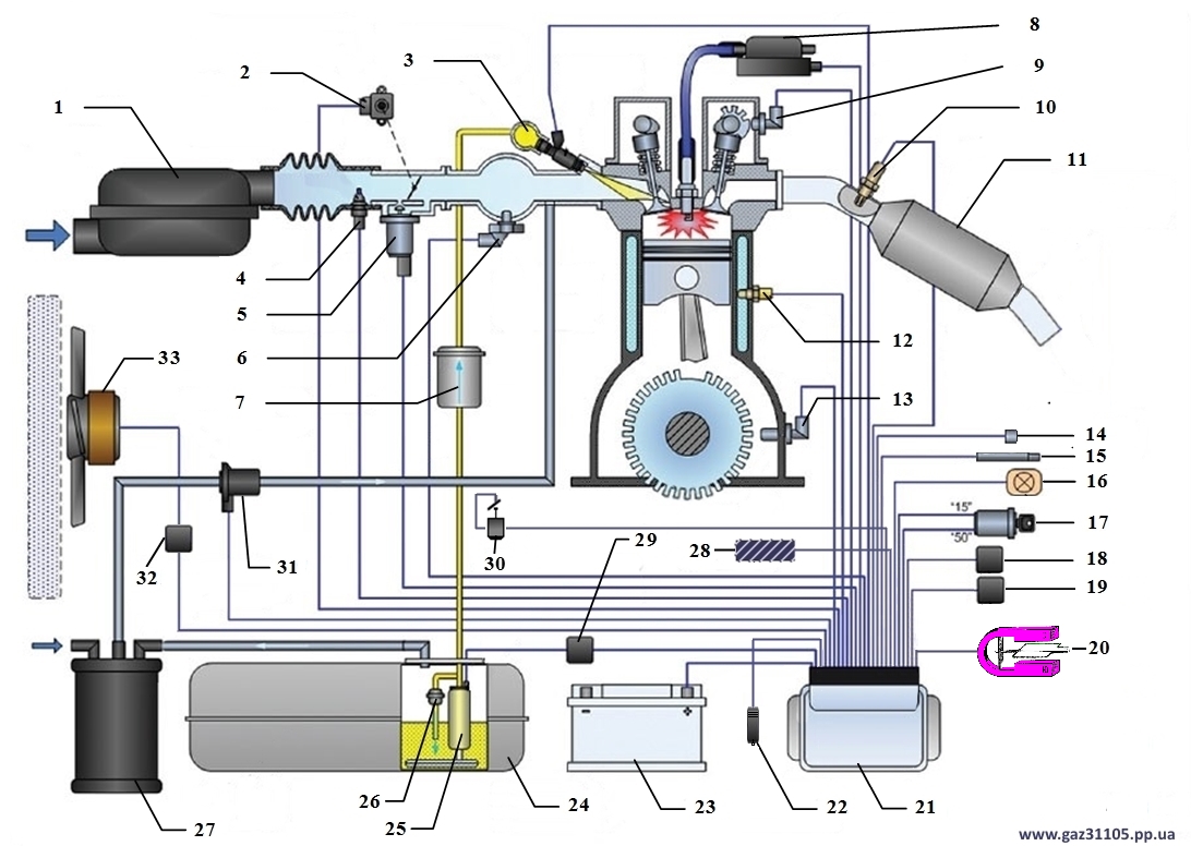 1: Некоторое количество ГАЗ-31105 было выпущено без адсорбера паров топлива. Соответственно система вентиляции бака отсутствовала. Скорее всего такие машины не имели нейтрализатора (отображено на схеме "Евро 1"). Т.о. машины без нейтрализатора скорее всего бывают с системой дожига паров топлива или без таковой.