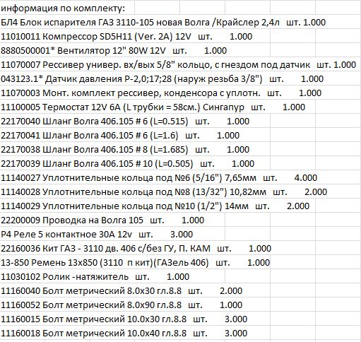 1. Компрессор кондиционера. Обычно всегда SANDEN SD5H11 исполнение s6328 (хладагент R134a, шкив бывает как под клиновые ремни так и под поликлиновый). Точно подходящий по габаритам, производительности и штуцерам присоединения на ЗМЗ-406 агрегат. На практике устанавливались и другие компрессоры, например SANDEN SD7H13 и другие 7-ми поршневые (например для SCS/Frigette), часто с "подгонкой по месту" самого компрессора. Также на старых комплектах (под хладагент R12) часто встречается SANDEN SD-508 s8390 со шкивом под два клиновых ремня. На ГАЗ-31105 Chrysler устанавливался NIPPONDENSO 10s17c (55037578АС), однако встречается информация об установке того-же SANDEN SD5H11 на специальные кронштейны. Компоновка Chrysler позволяет устанавливать многие компрессоры (в частности SANDEN SD7H15), от незаводских комплектов. Повторюсь, документально для Chrysler предписывается NIPPONDENSO.