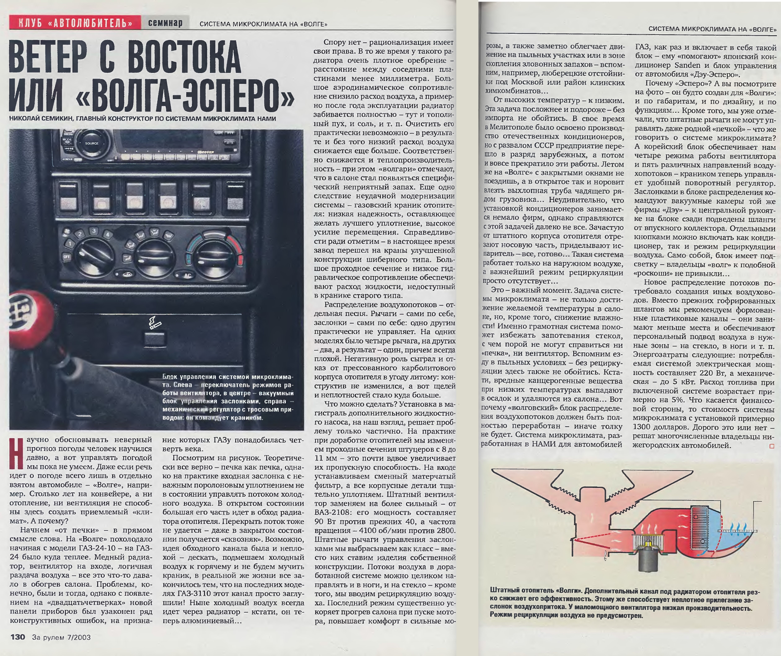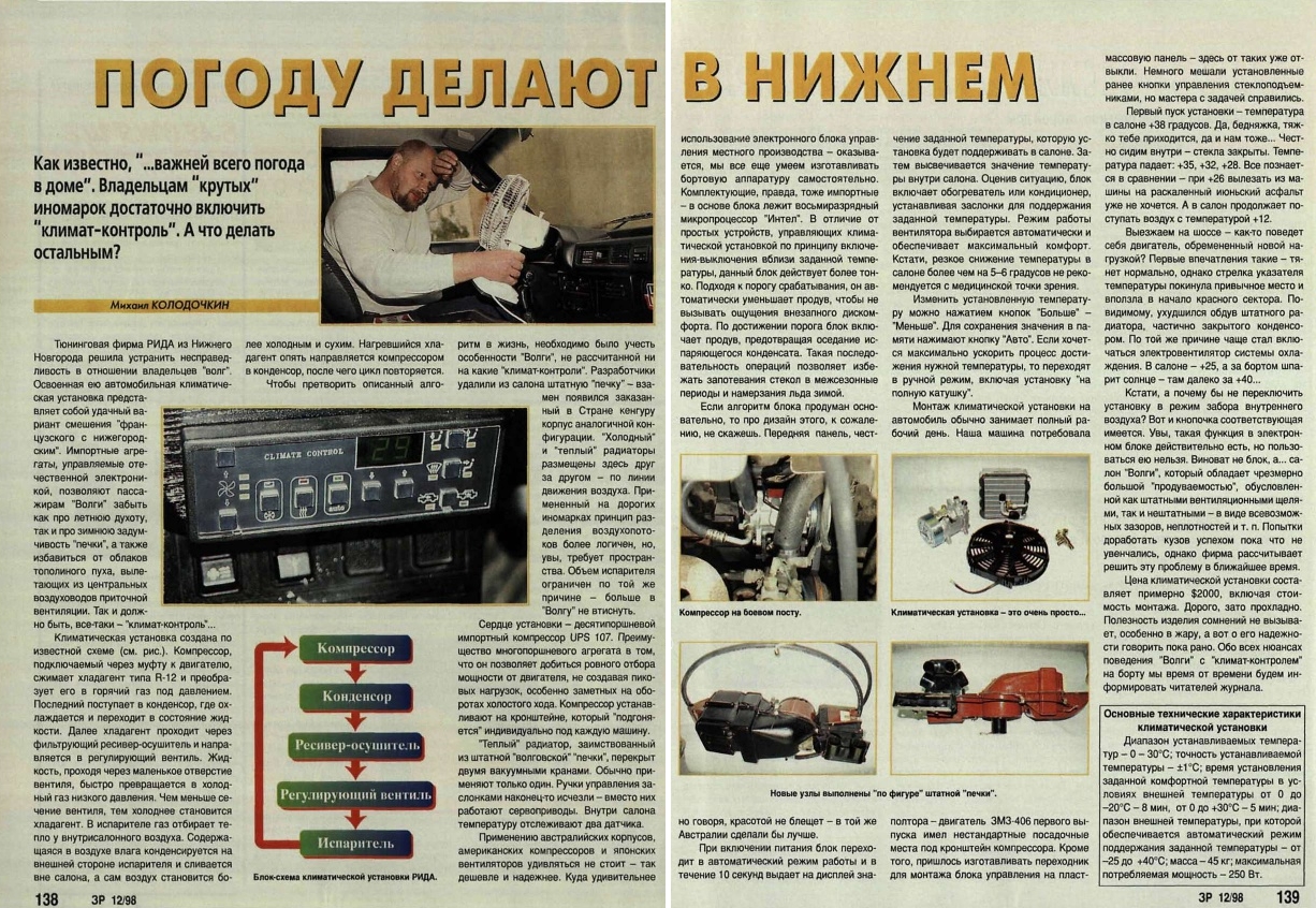 Широко известная и отлично зарекомендовавшая себя фирма "РИДА" (г. Нижний Новгород) стала первой, кто начал устанавливать комплекты климатики на автомобили "Волга". Статья в "За Рулем" 12/1998 "Погоду делают в Нижнем" исчерпывающе описывает особенности установки.