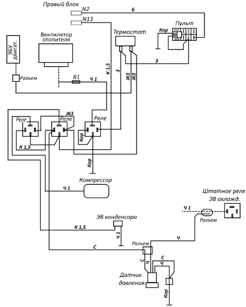 Для частной реализации "правильной" схемы включения (без датчика давления) необходимо добавить проводку и контакты в разъем ЭБУ (для ЗМЗ). Обычно всего этого нет. Однако редко встречаются машины с "полной кондиционерной" проводкой в комплектации без кондиционера.