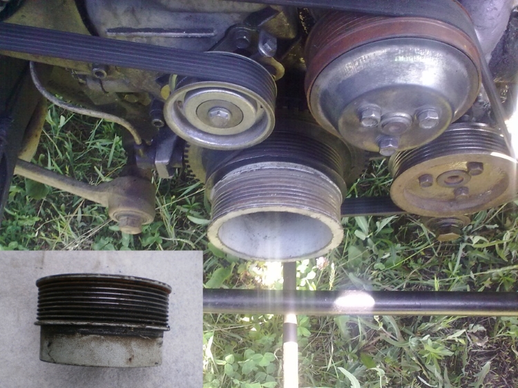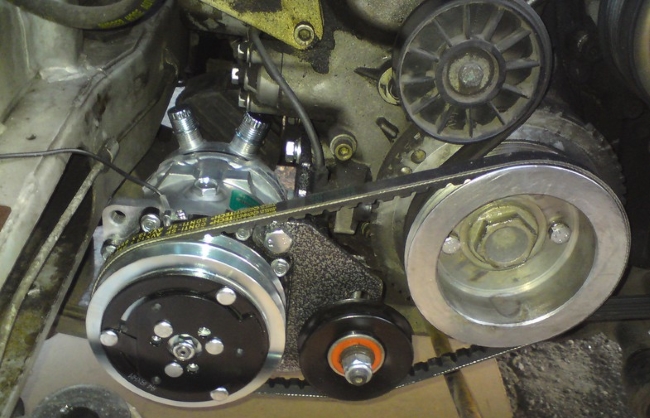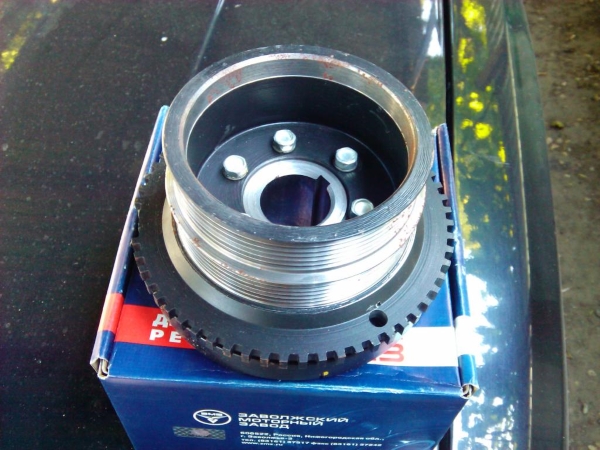 Для незаводских решений применялась вставка в обычный демпферный шкив, для центровки которой на шкиве всегда есть два отверстия с резьбой (отверстия - для установки съемника). Вылет вставок из разных комплектов может быть разный. Решение далеко не лучшее, поскольку усилие от работающей муфты компрессора кондиционера часто расшатывает демпферный шкив, и он приходит в негодность с различными последствиями для двигателя.