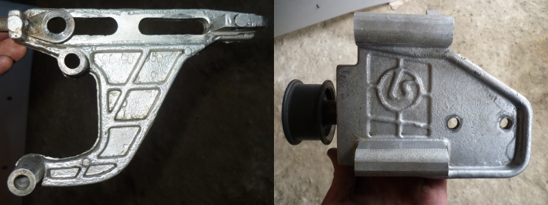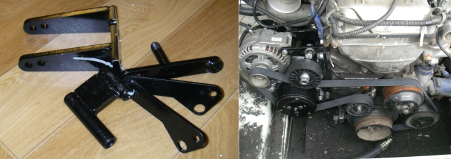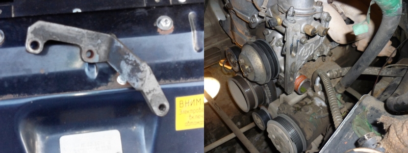 В зависимости от производителя незаводского оборудования кронштейны на ЗМЗ бывают разные. Соответственно вылет компрессора относительно шкива коленвала (ЗМЗ) тоже бывает разный. Заводские кронштейны (ЗМЗ) ниже на фото. В некоторых незаводских схемах (Элинж) помимо кронштейнов компрессора и насоса ГУР присутствует упор для одной из точек крепления насоса ОЖ.