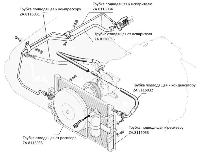 10. Шланги и трубки с фитингами, ТРВ. Заводские магистрали изготовлены с применением алюминиевых труб. Незаводские - чаще шланги. ТРВ (термо-расширяющий вентиль) в стандарте - на входе в испаритель под капотом. На альтернативных комплектах - часто внутри салонного блока.