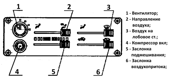 Пультов управления производитель не предлагает. Соответственно нет обратной связи и рециркуляции. Имеется только переключатель на включение цепи компрессора. В инструкции значится включать вентилятор отопителя и регулировать степень охлаждения салона именно его оборотами.