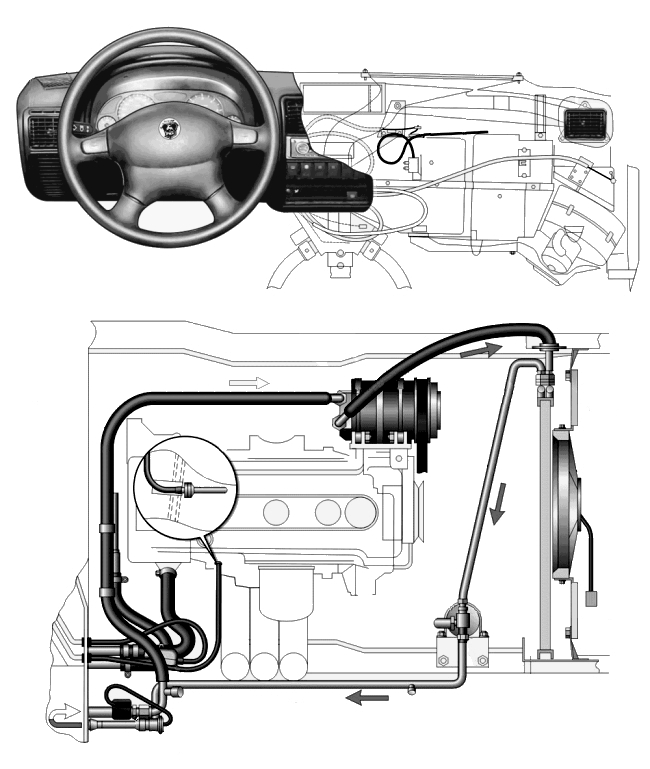Из особенностей салонного блока стОит упомянуть неспособность (из-за расположения в корпусе) радиатора отопителя эффективно отдавать тепло. При этом отбор тепла из воздуха испарителем кондиционера, и, соответственно, производительность всей системы кондиционирования были "на высоте" (как и надежность паяного испарителя, сделанного в горячей солнечной Мексике).