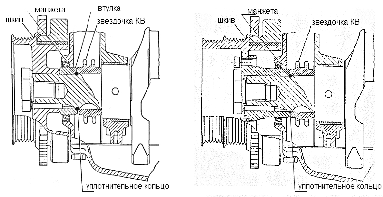 Шкив под два ремня прессуется на КВ с бОльшим усилием нежели обычный. Теперь он выполняет роль фиксатора звездочки КВ. В некоторых случаях требуется развертка посадочной поверхности шкива до размеров посадочной поверхности снятой втулки. Можно, конечно, забить шкив, а потом сдергивать его съемником, но периодическое, пусть редкое, снятие его всё равно потребуется (для замены манжеты), и поэтому индивидуальный подход по замене шкива в каждом конкретном случае имеет место быть.