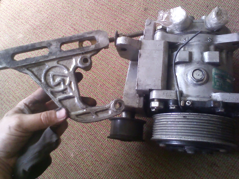 Старый чугунный кронштейн насоса ГУР убираем, сам насос – на полку АКБ. Шкив КВ снять. Ставим новый красивый кронштейн компрессора с обводным роликом и сам компрессор. Пока что они сияют и блестят. Ролик (маркировка 2112-1006135) я снимал для смазки его подшипника. Как и в случае с обычным натяжным роликом при слишком легком вращении подшипник требует смазки. Так и есть – под крышечками сепаратора ни намека не нее. Подшипник ролика вымыт в керосине и напихан свежим «Литолом».