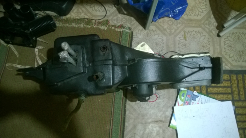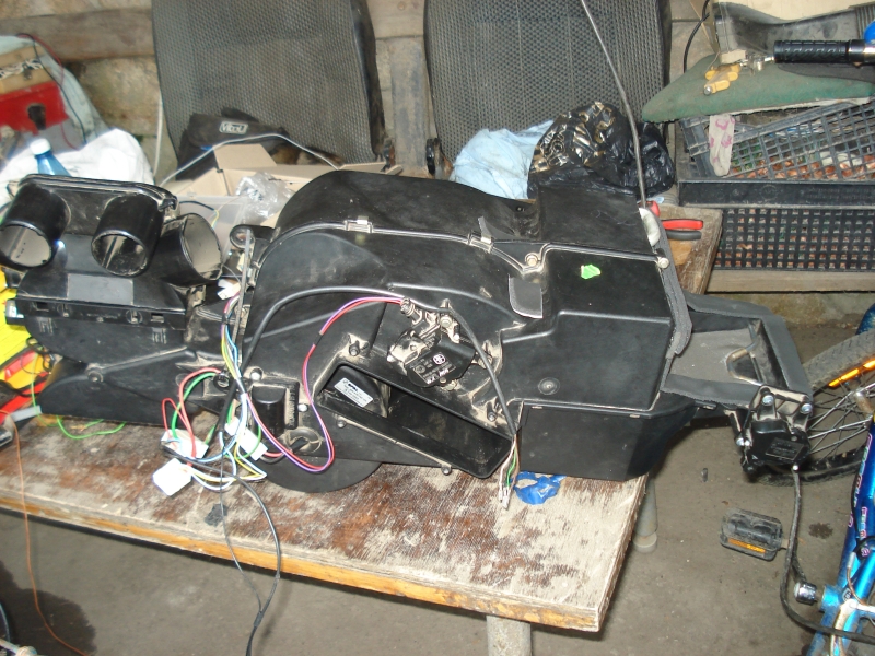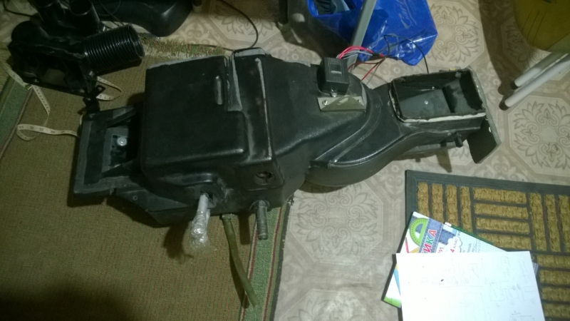 Ну вот, агрегат отопителя, который самый разнаиновейший, и самый модный конечно, предназначенный для установки испарителя – на столе у меня в лапах. Сам испаритель, точно подходящий по размерам, но не стандартный – лежит рядом. Дело за малым – скрестить испаритель и салонный блок, а также добавить электрозадвижек по вкусу. Две недели, друзья! Две недели работы.