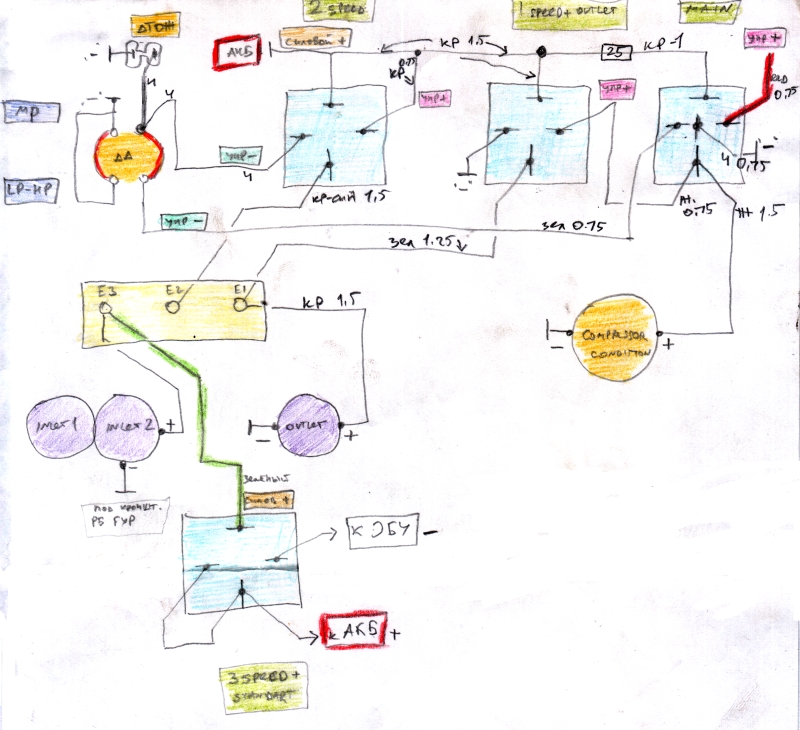 Я остановился на схеме с тремя реле. Первое – «главное реле», второе – вентилятора конденсера и второй скорости вентиляторов радиатора и третье – вторая скорость вентиляторов радиатора. Есть еще четвертое реле – штатное на 70А вентилятора охлаждения. Оно у меня управляется ЭБУ КМСУД, и оставлено выполнять свои привычные функции. По достижении 95 градусов ОЖ оба вентилятора включаются на полную мощность именно через него.