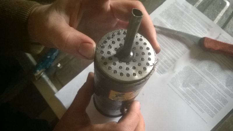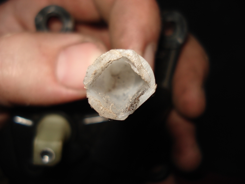 Старый осушитель я распилил ножовкой поперёк. От входящего штуцера шла трубка вниз. Внизу трубки между двумя шайбами находился синтепоновый наполнитель – это фильтр. Шайбы отделяли нижнюю часть полости ресивера от верхней. В нижней части был засыпан селикагель в шариках – это осушитель. Фреон, пройдя через гель и фильтр, попадал в верхнюю часть стакана, которая занимает примерно 5/6 объема – это ресивер. Из верхней полости фреон перетекает в выводной штуцер.