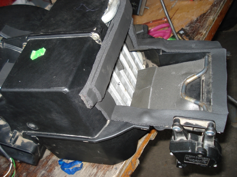 Ну что – теперь трубки выходят со стороны радиатора отопителя и даже под капот, подача хладагрента в ТРВ сверху вниз, корпус отопителя закрывается, только порезать его пришлось внизу и сбоку из-за негабарита трубок. Также с испарителя сняты верхняя и нижняя родные полистироловые крышки, а пространство, которое он оставил с боков между собой и корпусом (немалое) заткнуто самоклеящимся поролоном (здесь неправ, поролон преет, я просто забыл, по возможности заменю). Еще пришлось изуродовать заслонку подмешивания, амплитуде которой мешали те-же трубки испарителя. Я просто вырезал в ней куски пластика вокруг трубок. Внизу, чтобы изолировать холодный воздух, в том месте где паркуется заслонка, я наклеил на корпус отопителя дополнительный лист самоклейки. Заслонка ложится на лист, и вырезы в ней воздух больше не пропускают. Ну и кран должен быть рабочий естественно, для полной изоляции теплого воздуха.