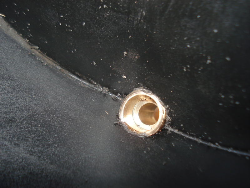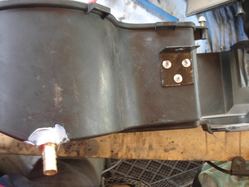 Остановлюсь на переделке корпуса 31107 под испаритель. С завода на месте входа-выхода фреоновых трубок в корпусе находится резиновая заглушка. Маленькие заглушки есть на месте крепления оси заслонки рециркуляции. Заглушки стоит только выдавить, и ничего не надо мудрить. Тем не менее необходимо организовать дополнительный дренаж по совету «Элинж». Родной дренаж, для отвода конденсированной влаги со стенок испарителя, находится в аккурат под самими испарителем. Дополнительный дренаж надо организовать в самой нижней точке корпуса отопителя. И в самом деле – там влага даже от работы тосольного нагревателя скапливается. Своими глазами увидел жидкость, когда располовинил блок. Понятно, что воздухом туда будет заносить воду с испарителя, а деваться из этой ванны ей просто будет некуда. Выход под вторую трубку дренажа сделал из винтового штуцера для каких-то сантехнических дел. Штуцер вкручен в корпус отопителя под углом 45 градусов к горизонту. Уплотнен герметиком и сточен напильником для полного неприпятствия стеканию любого количества воды.