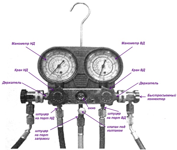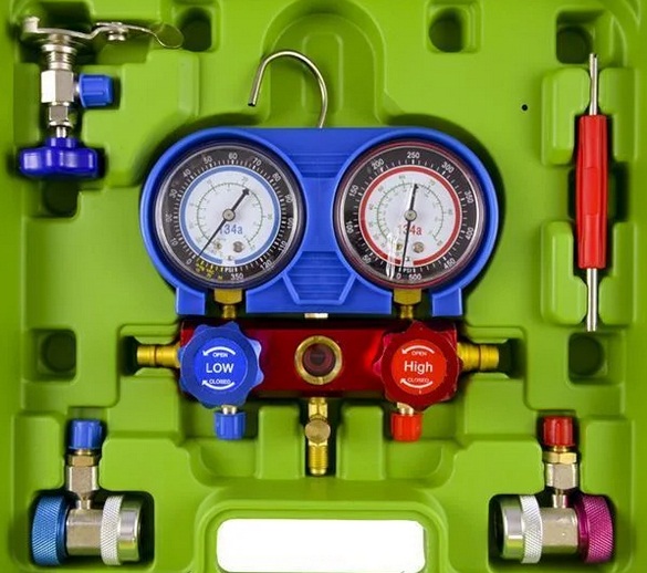 Устройство показывает давление хладона в системе кондиционирования. Так же при помощи коллектора производится заправка и/или вакуумирование системы.