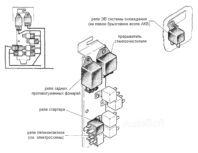 !Внимание! Информация по реле почерпнута из литературы. Назначение "обычных" 5 и 4-х конактные реле, расположенных слева на панели в ногах водителя лучше сверять с электрической схемой.