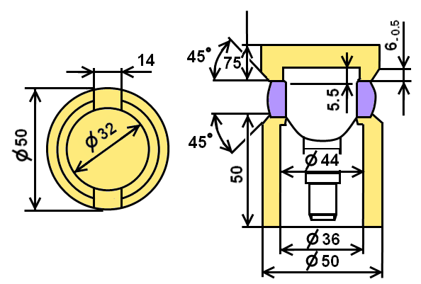 Оправка состоит из двух деталей - нажимной пяты и опорной втулки (на рисунке обозначены желтым цветом). В пяте сделаны два противоположных паза под шплинт и выточка глубиной 5,5-6 мм (для шарниров "31105-" соответственно 6,5-7 мм), ограничивающая правильное положение шарнира относительно торца головки наконечника или рулевой тяги (обозначены фиолетовым цветом).
